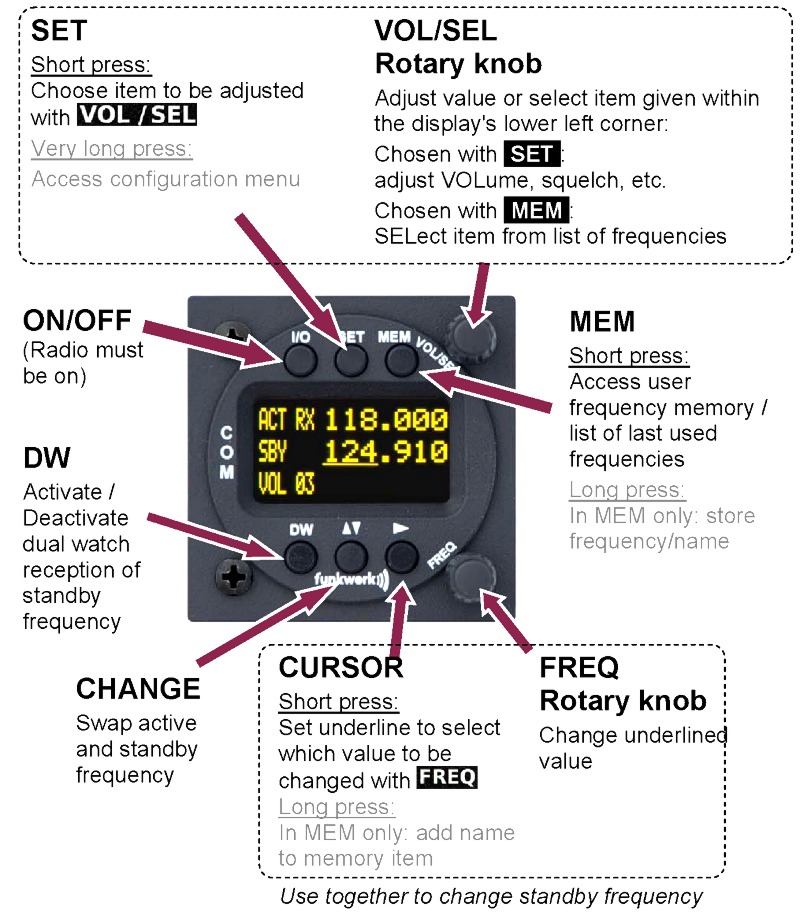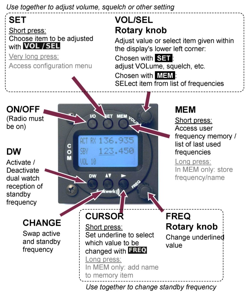 Features: 760 channel VHF transceiver compact - fits in 2.25" round hole in instrument panel OLED display for best readability under all conditions dual-watch technology, simultaneous monitoring of two frequencies fast alphanumeric database search built-in VOX intercom for up to 4 microphones memory for up to 100 user-definable named frequencies full 6W carrier output auto TX cut-out after 2 minutes German quality -- full two-year warranty |